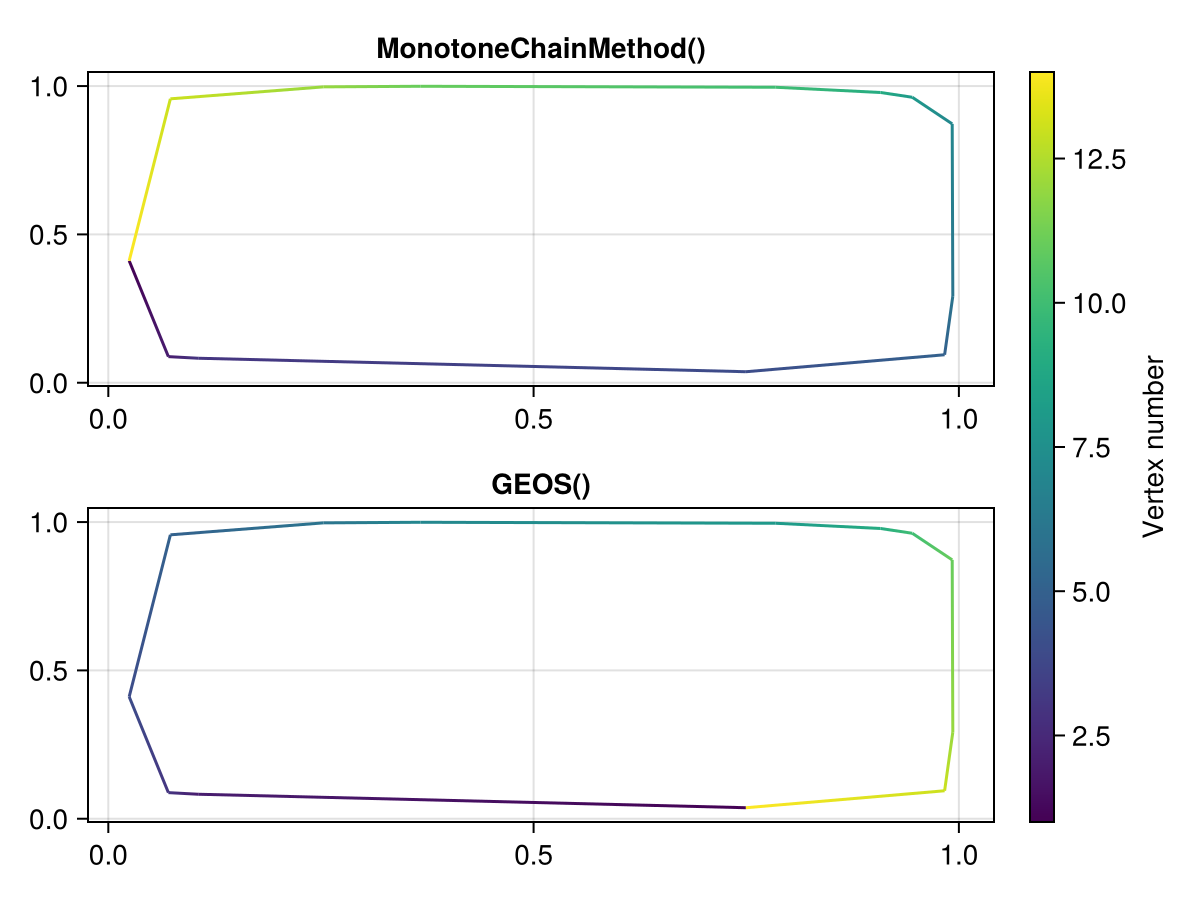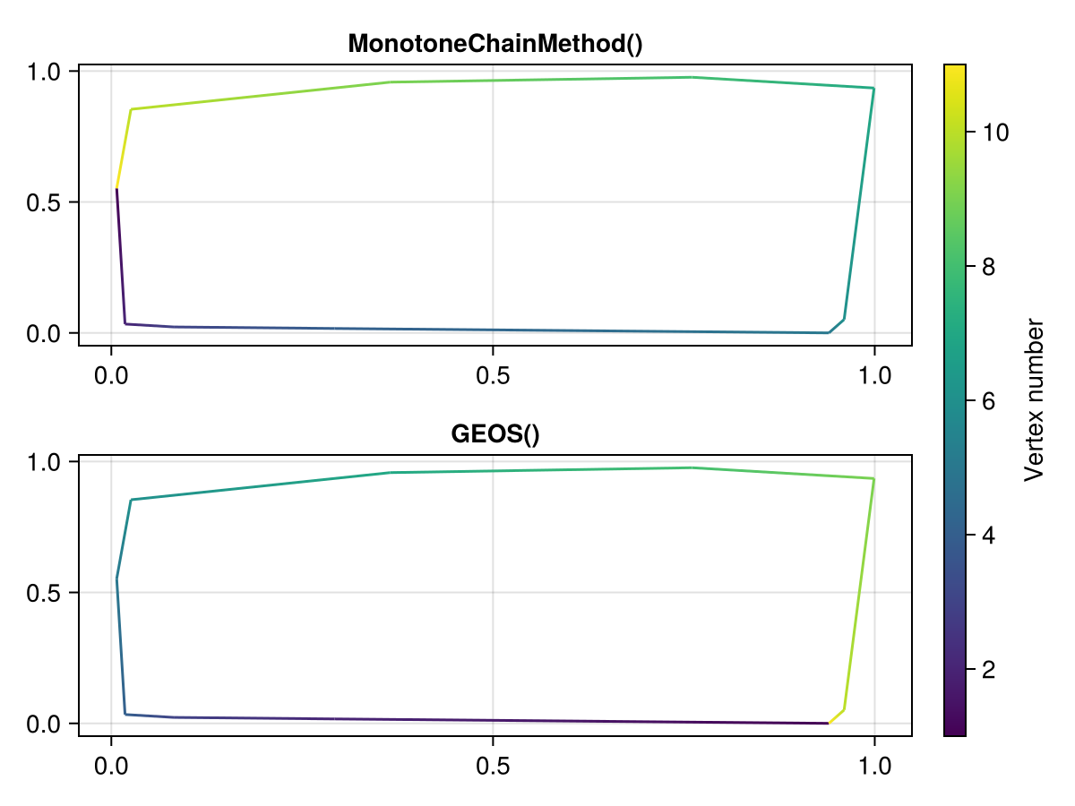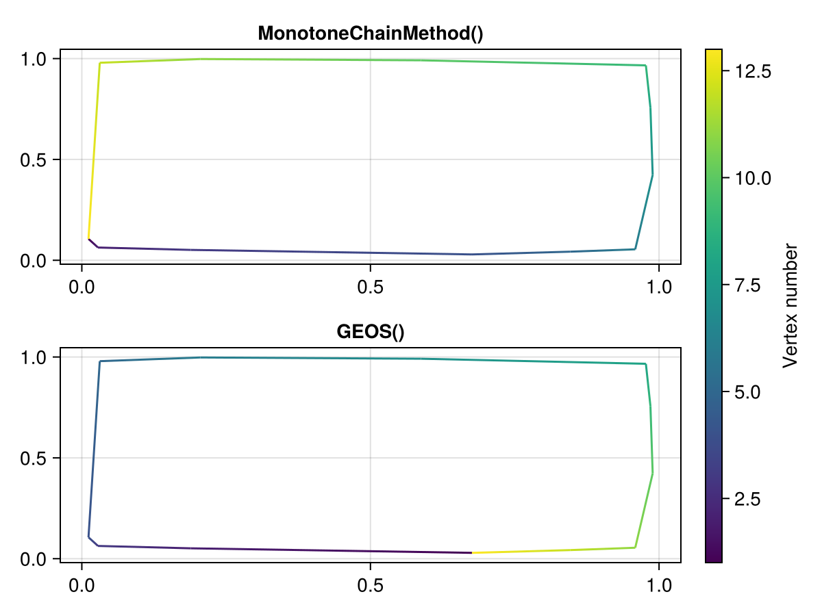 For now, we expose one algorithm, MonotoneChainMethod, which uses the DelaunayTriangulation.jl package. The GEOS() interface also supports convex hulls.
