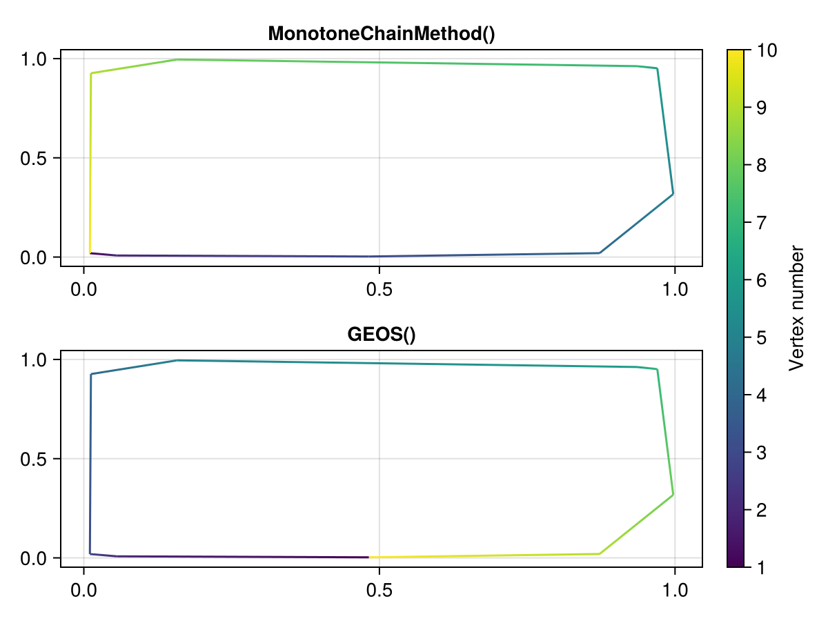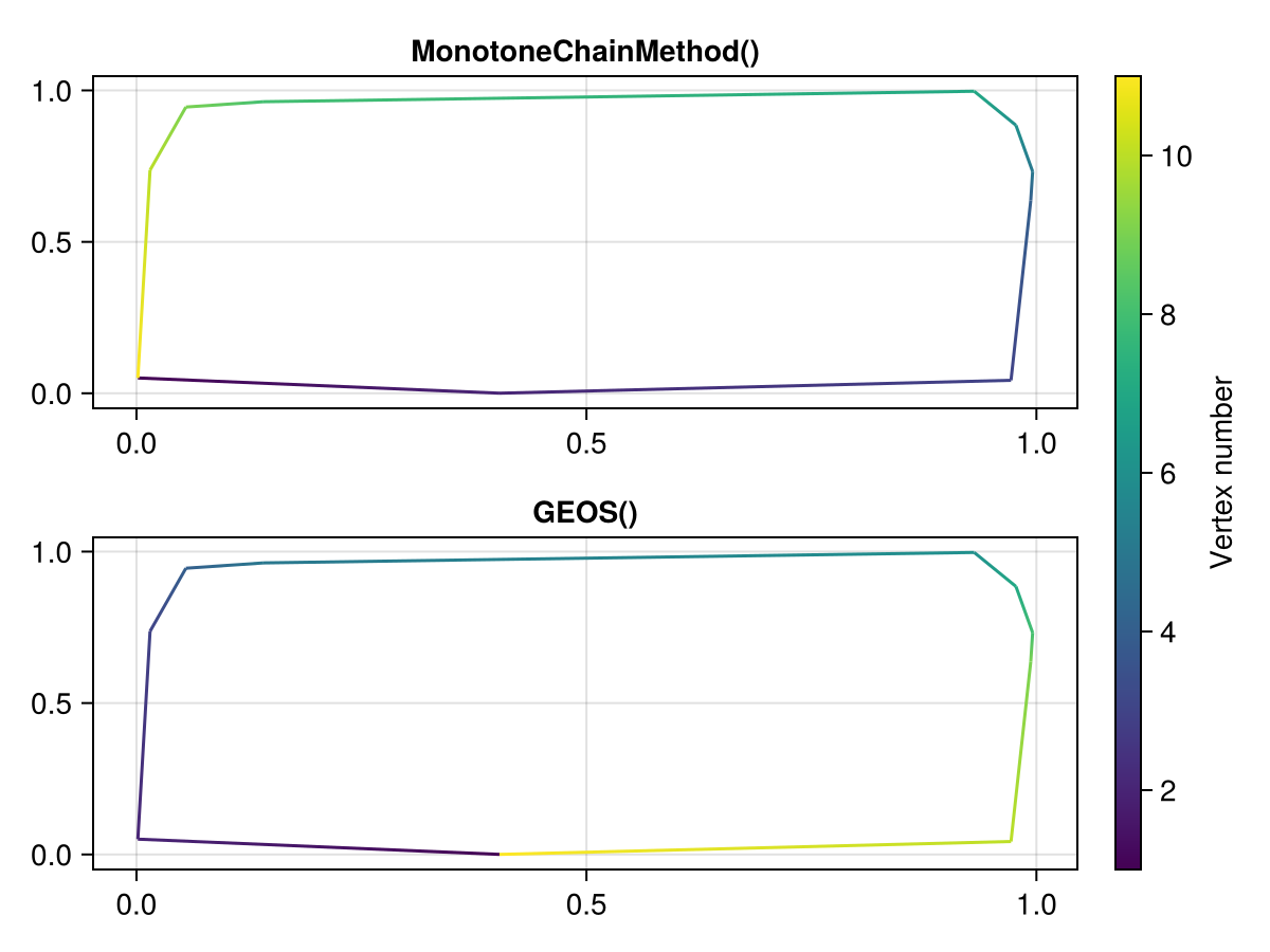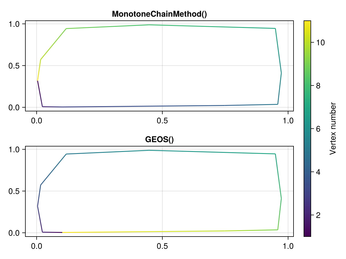 For now, we expose one algorithm, MonotoneChainMethod, which uses the DelaunayTriangulation.jl package. The GEOS() interface also supports convex hulls.