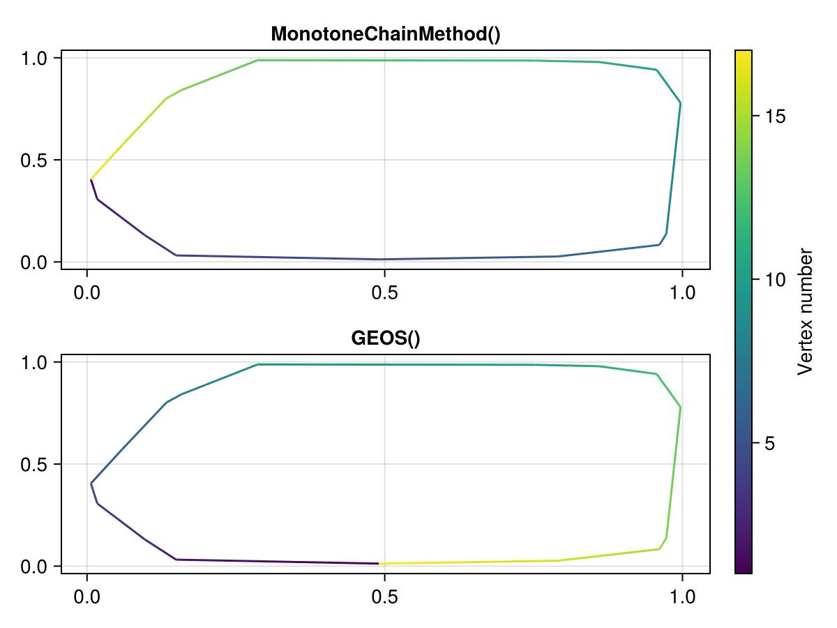 For now, we expose one algorithm, MonotoneChainMethod, which uses the DelaunayTriangulation.jl package. The GEOS()