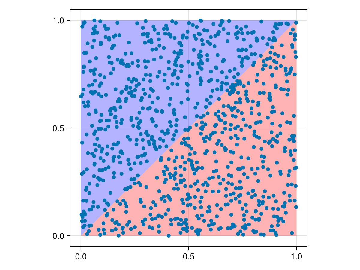 First, we generate our data. We create two triangle polygons which, together, span the rectangle (0, 0, 1, 1), and a set of points which are randomly distributed within this rectangle.