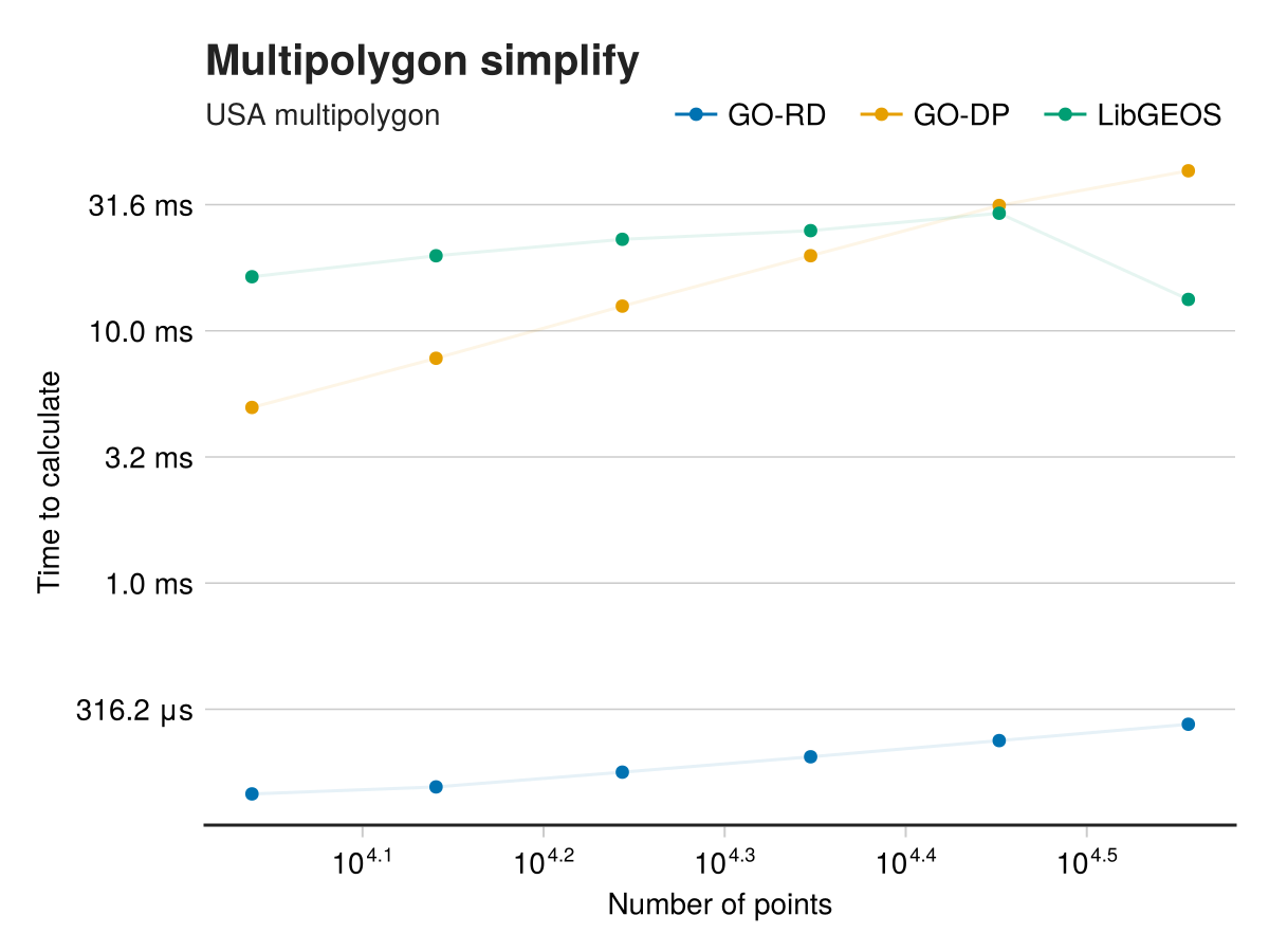 We benchmark these methods against LibGEOS's simplify implementation, which uses the Douglas-Peucker algorithm.