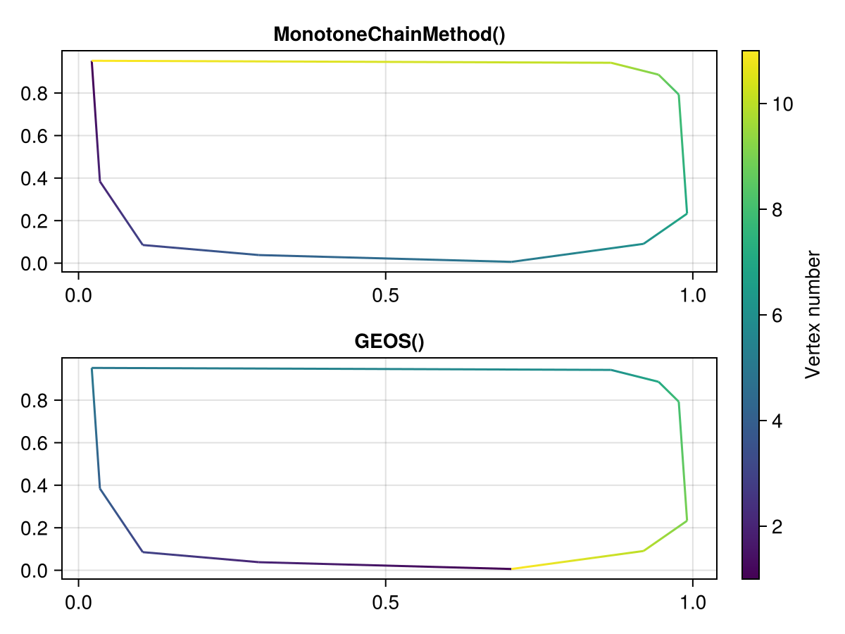 For now, we expose one algorithm, MonotoneChainMethod, which uses the DelaunayTriangulation.jl package. The GEOS()