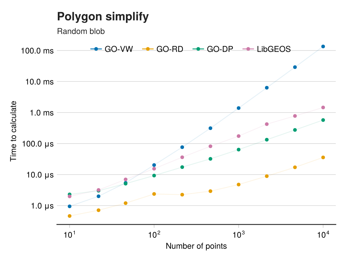 We benchmark these methods against LibGEOS's simplify implementation, which uses the Douglas-Peucker algorithm.