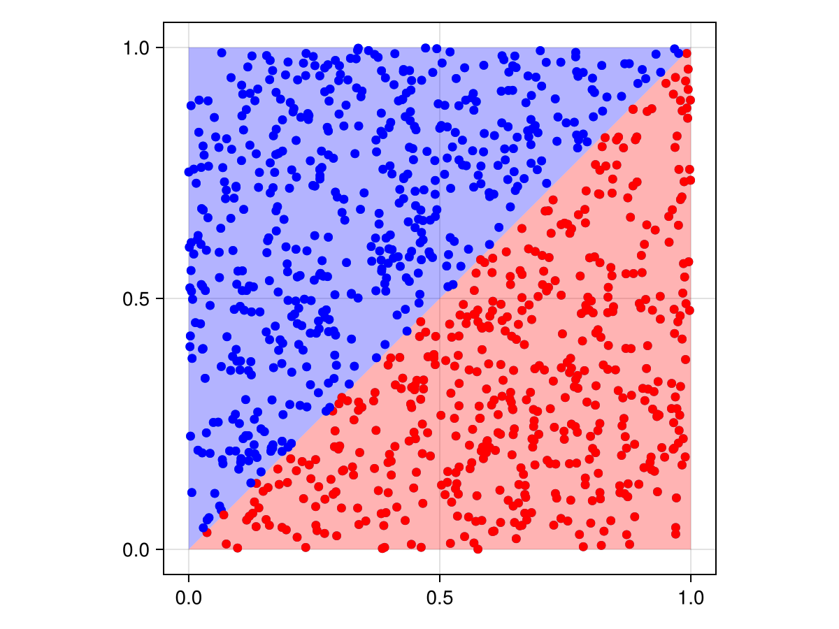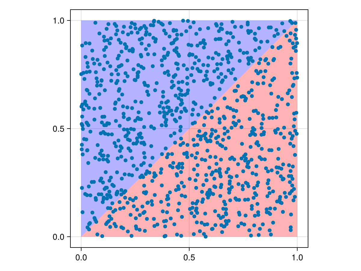First, we generate our data. We create two triangle polygons which, together, span the rectangle (0, 0, 1, 1), and a set of points which are randomly distributed within this rectangle.