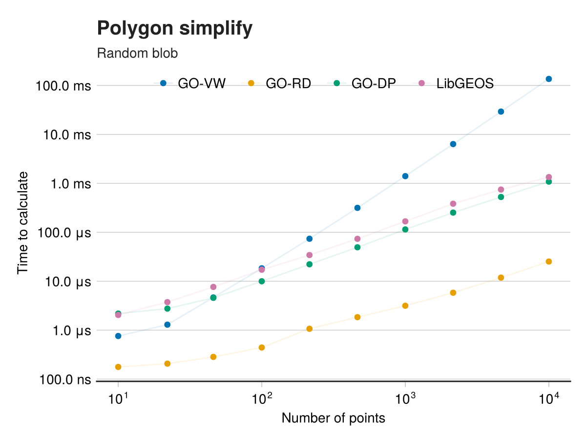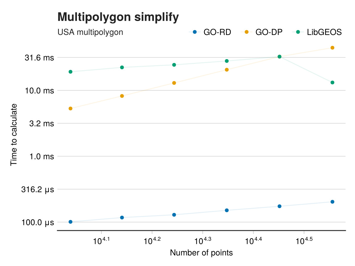 We benchmark these methods against LibGEOS's simplify implementation, which uses the Douglas-Peucker algorithm.