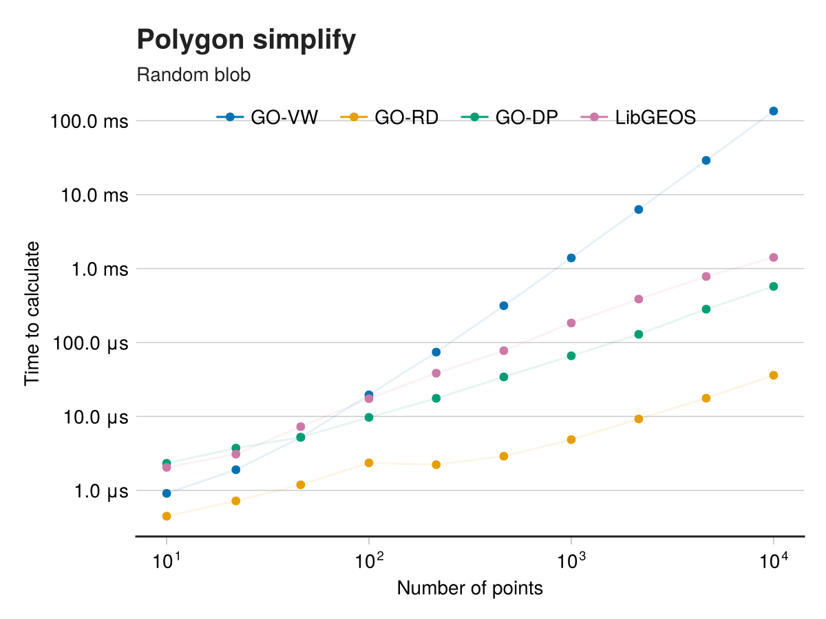 We benchmark these methods against LibGEOS's simplify implementation, which uses the Douglas-Peucker algorithm.